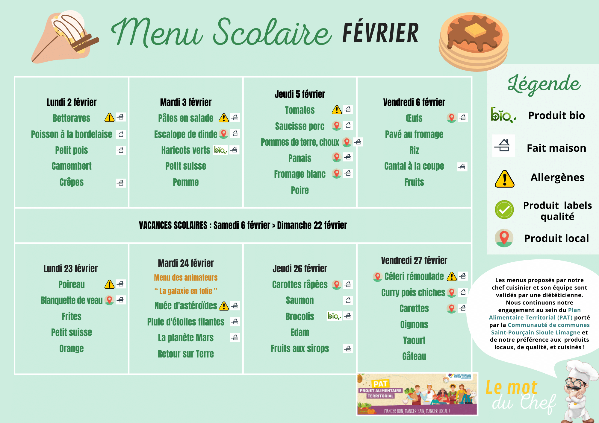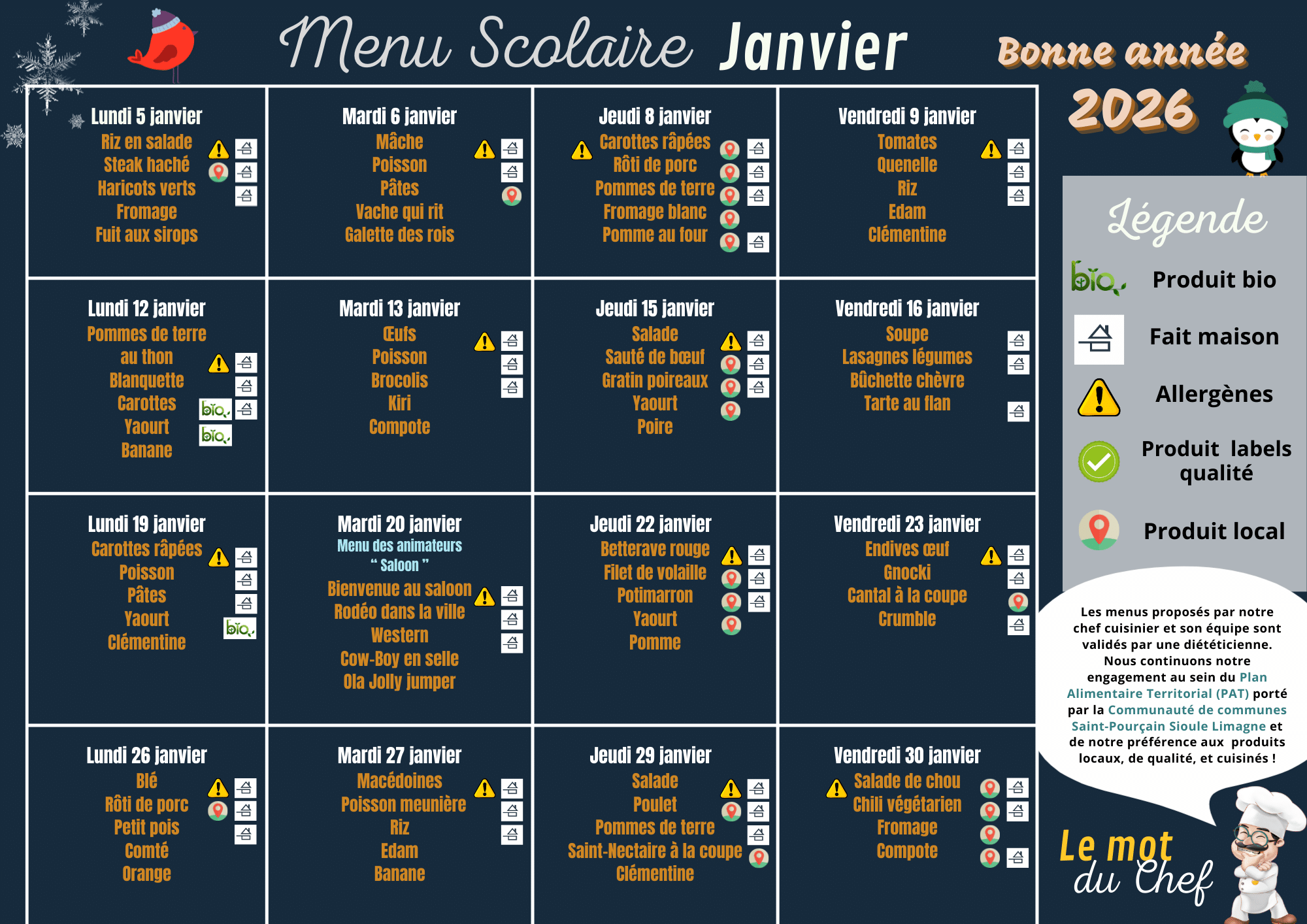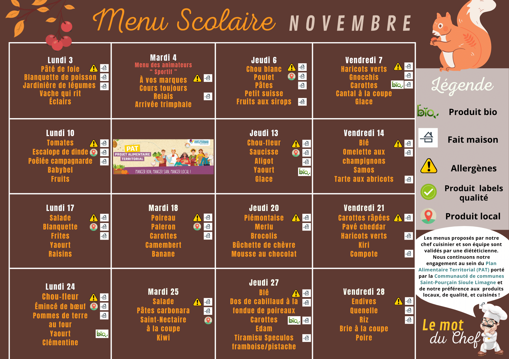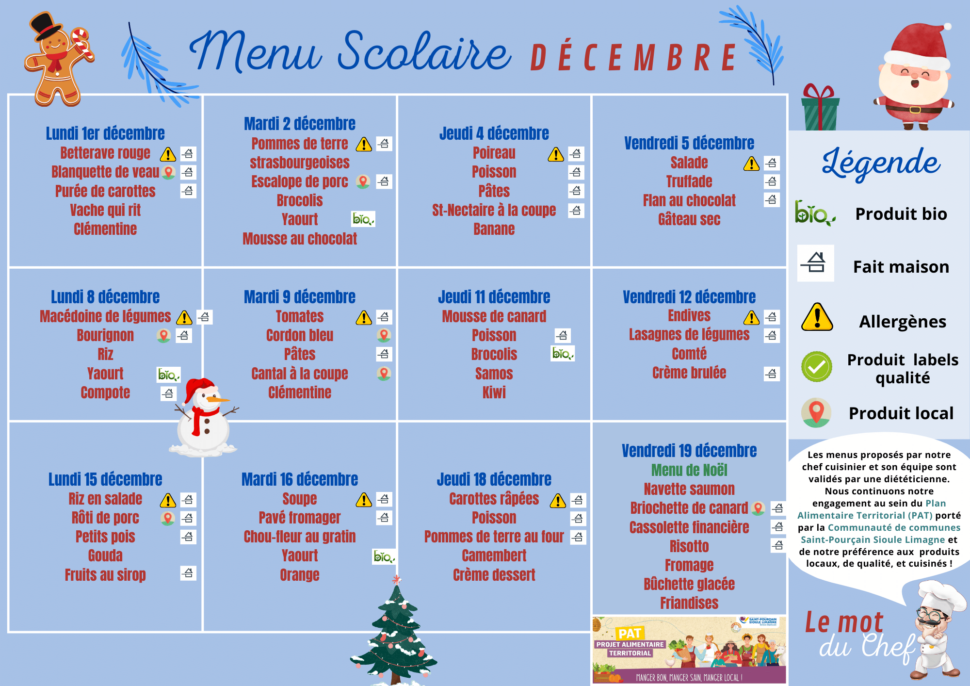 Les menus sont élaborés par le chef cuisinier, en collaboration avec une diététicienne. Le Conseil Municipal des Enfants (CME) ainsi que les équipes d’animation participent également à la création de certains menus, afin de les adapter aux goûts et besoins des enfants.